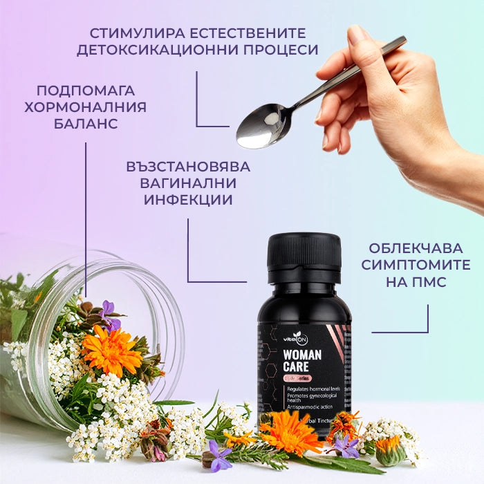 Les plantes de la teinture 'Woman care' ont une puissante action antioxydante et anti-inflammatoire. Elles ont un effet apaisant sur les organes avec une couche de muscle lisse dans leurs parois, tels que ceux du système digestif, urinaire et reproducteur féminin.